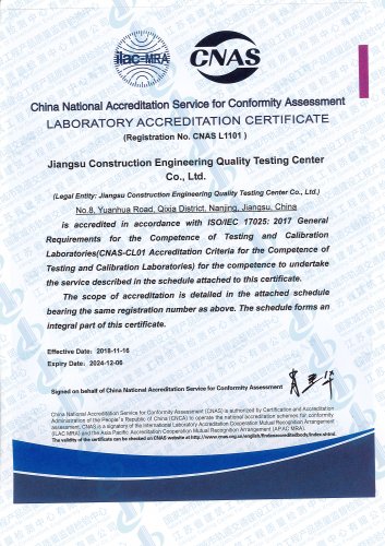 國家城市軌道交通建設(shè)工程產(chǎn)品質(zhì)量監(jiān)督檢驗中心, 依托江蘇省建筑科學(xué)研究院和江蘇省建筑工程質(zhì)量檢測中心在城市軌道交通建設(shè)工程領(lǐng)域的綜合技術(shù)優(yōu)勢,于2016年10月獲得國家認(rèn)證認(rèn)可監(jiān)督委員會批準(zhǔn)授權(quán)..
